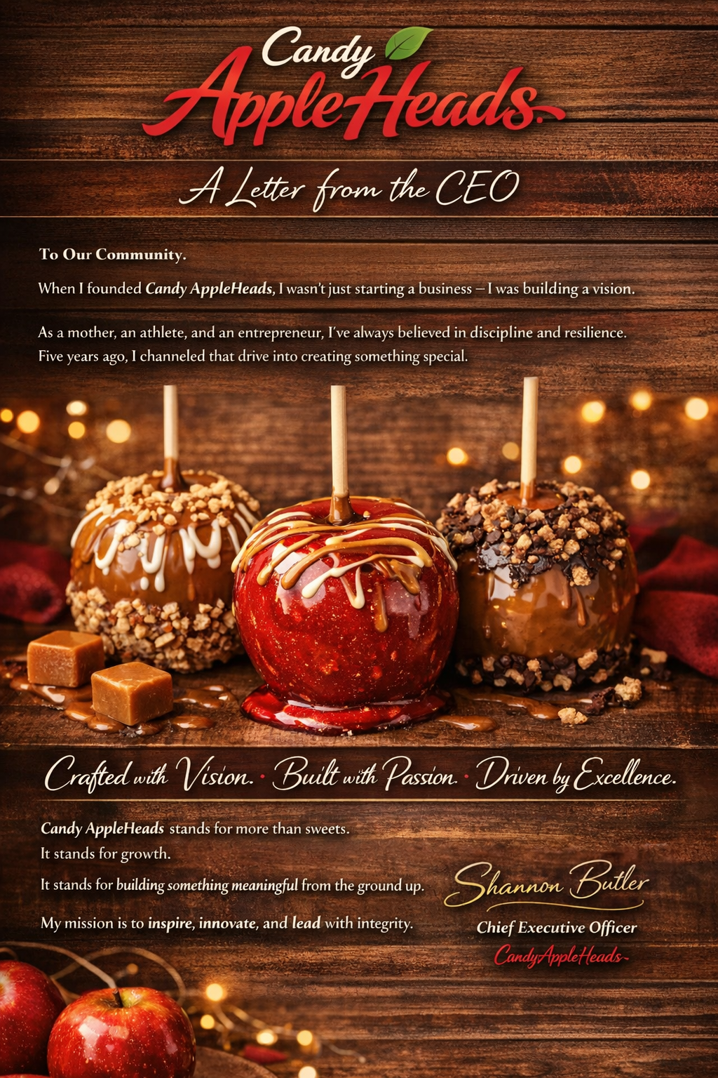 More than a confectionery company, Candy AppleHeads represents ambition, leadership, and the courage to build something meaningful from the ground up. Her mission is not only to create exceptional handcrafted candy apples, but to inspire others — especially women and mothers — to pursue entrepreneurship with confidence and determination.